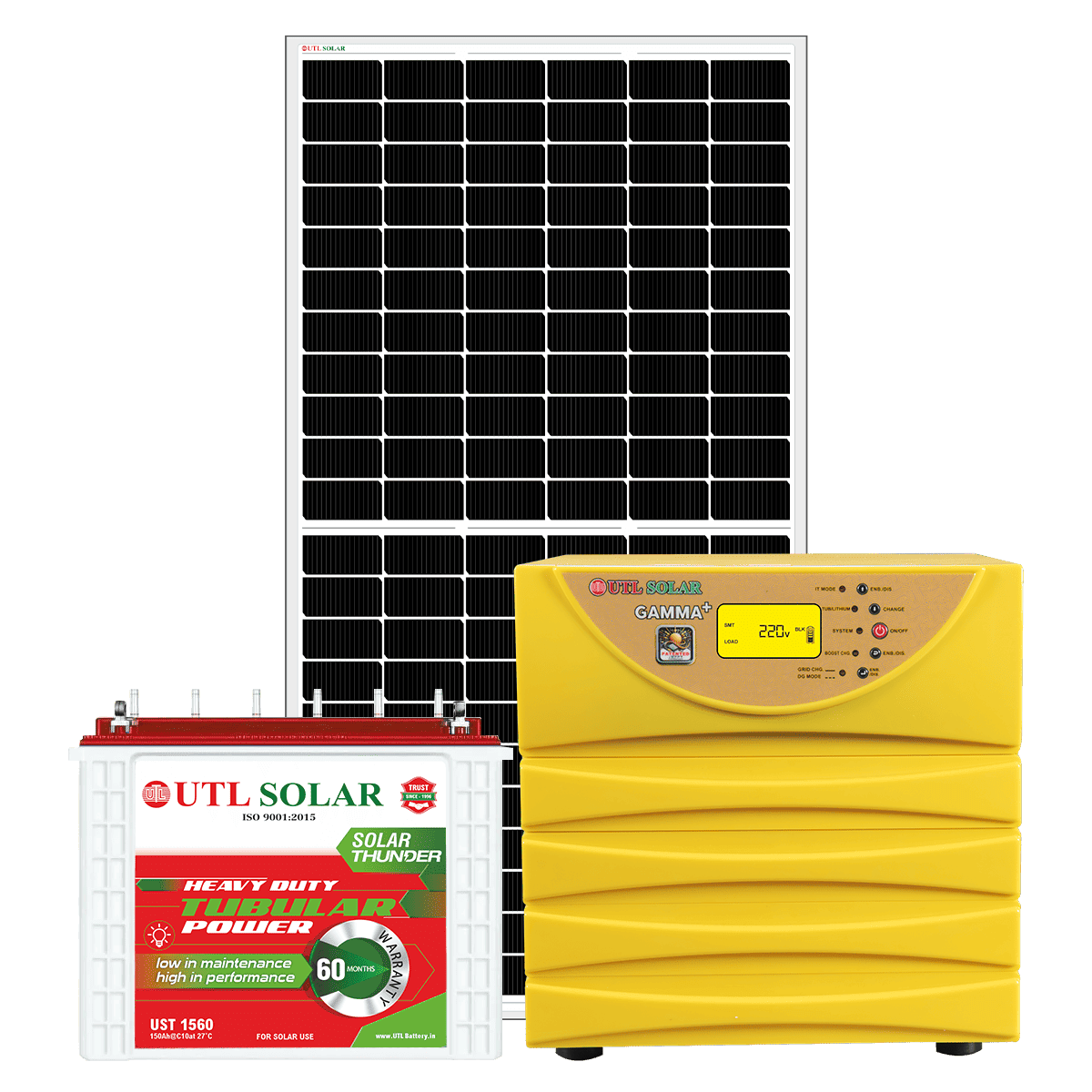This SPGS includes Gamma+ solar inverter that is built for better solar optimisation and stable output. Its advanced rMPPT technology enhances charging efficiency which helps in better use of available sunlight throughout the day. The inverter supports single-phase connections and comes with a 3-year warranty for added assurance. For energy storage it has UST 1560 lead-acid batteries that offer reliable backup and steady performance. This off-grid configuration ensures that your essential appliances continue running independently of the utility grid.