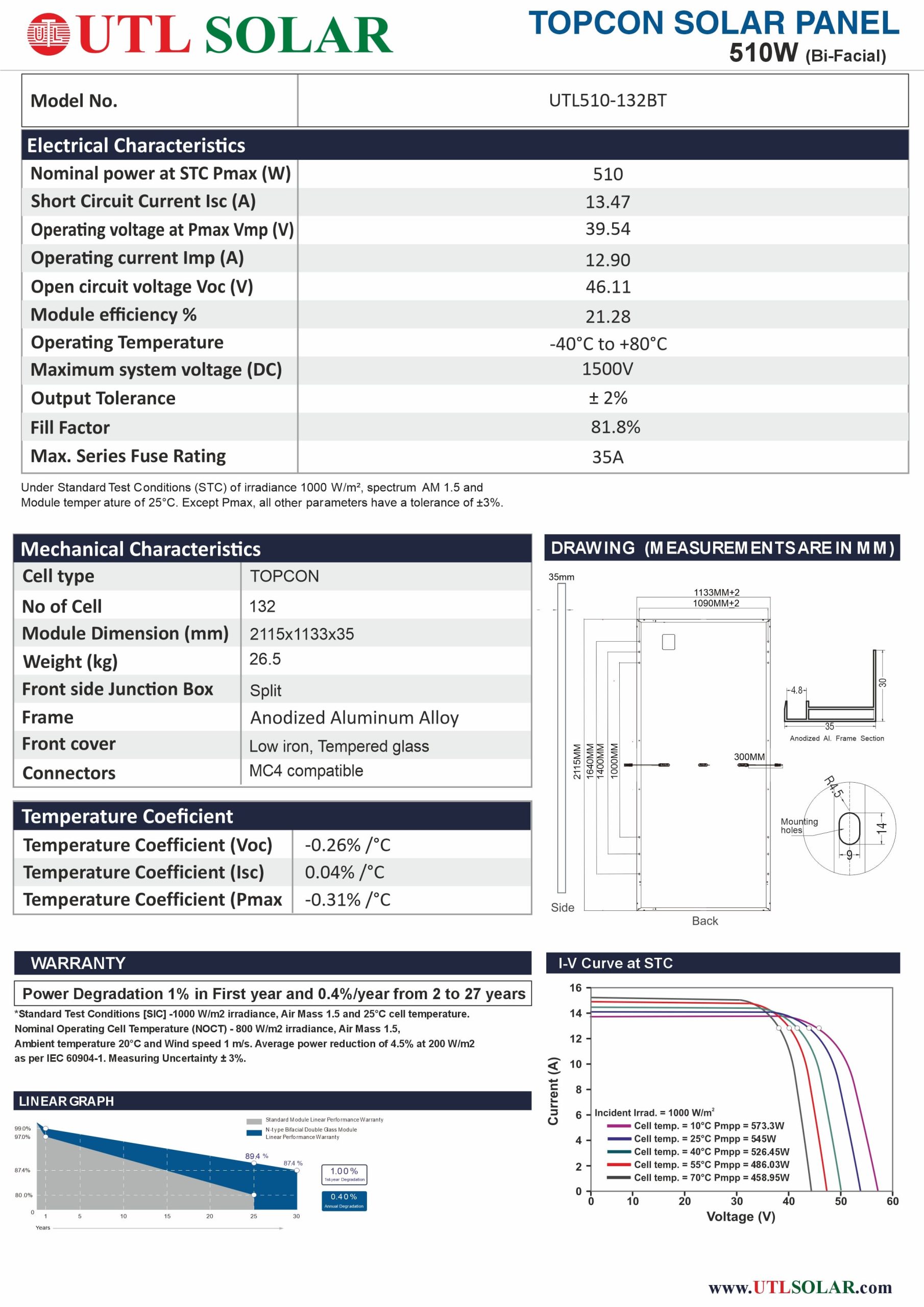 With a power rating of 510W and a module efficiency of 21.28%, this solar panel allows you to achieve more output from less roof space. Whether you’re designing a compact rooftop system or scaling up a large solar project, the UTL 510W Bifacial TOPCon panel reduces BOS (Balance of System) costs, improves energy yield, and delivers long-term value.