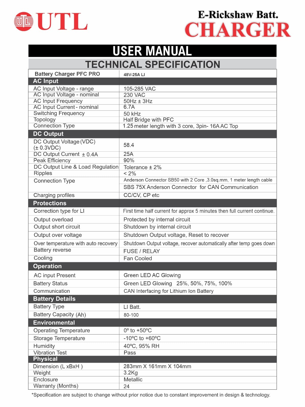 The UTL PFC PRO 48V-25A LI (58.4V) is a professional-grade charging solution engineered specifically for the demanding needs of the E-Rickshaw industry. Designed for high-performance Lithium-Ion batteries (80-100Ah), this charger combines Half Bridge with PFC (Power Factor Correction) topology to deliver ultra-efficient charging while reducing electricity waste.