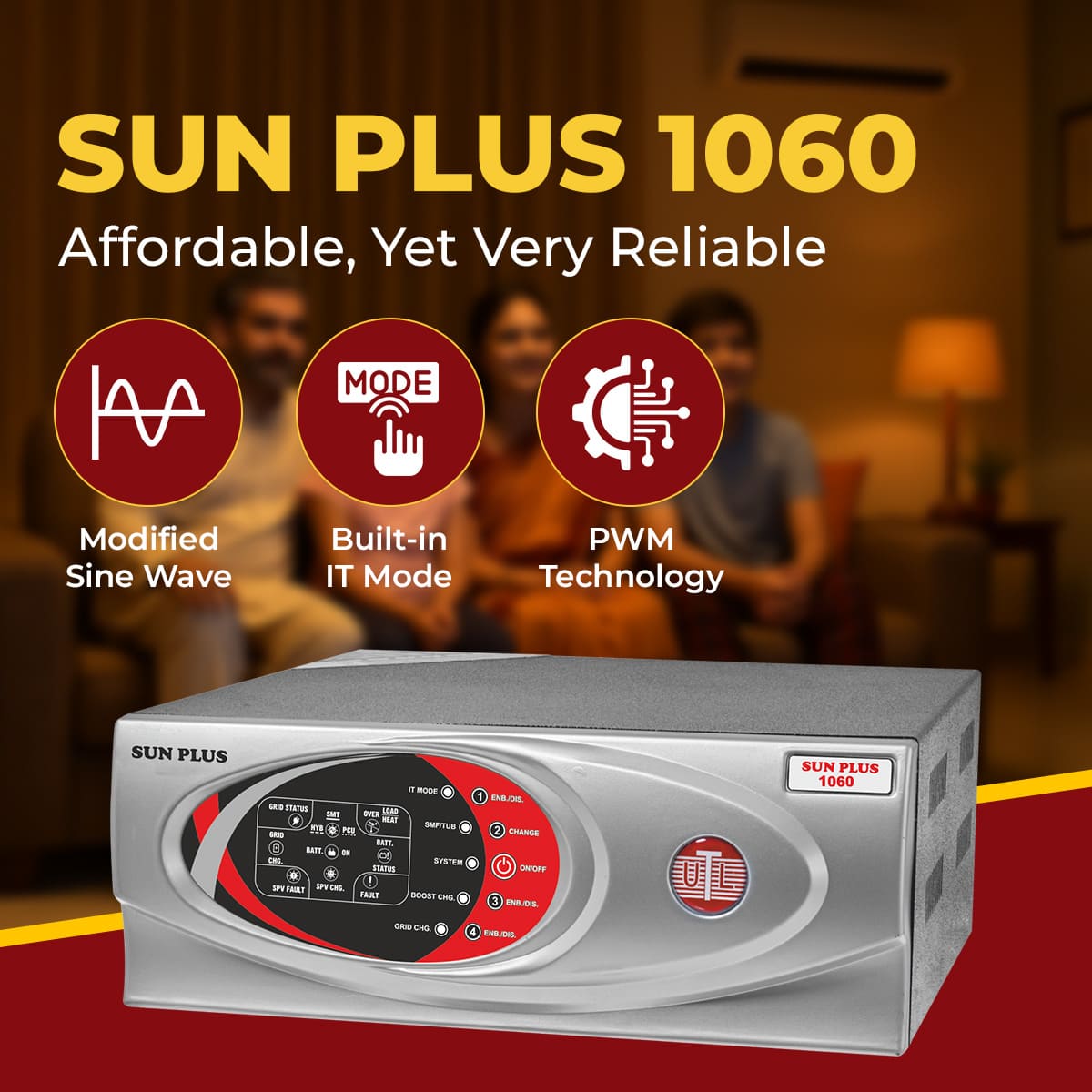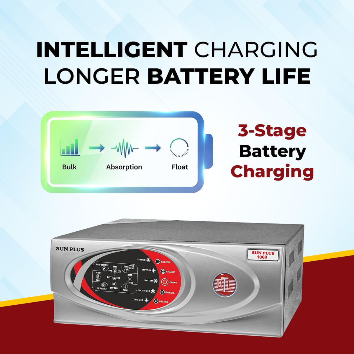 The Sun Plus 1060 home inverter is an ideal option for small setups, offering reliable power backup at an affordable cost. This affordable power backup source contains an LED display for operation & fault, making it user friendly. It includes an inbuilt PWM solar charge controller with multiple operating modes for efficient charging and operation. The home inverter keeps your battery healthier for longer through multi stages (Bulk, Absorption & Float) that avoids overcharging, stabilizes voltage, and optimizes every charge cycle to extend overall battery life.